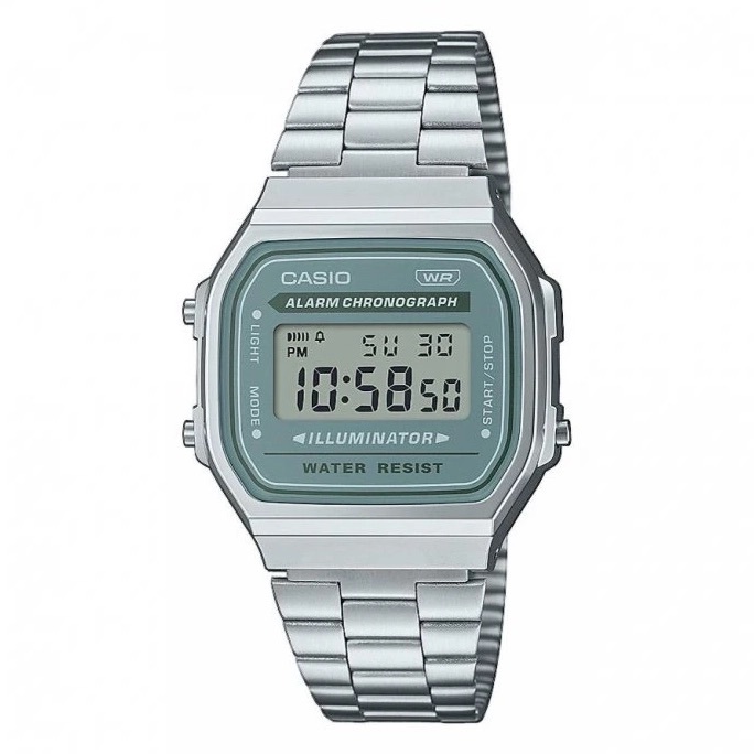 Stříbrno-šedivé hodinky Casio pro ženy i muže s digitálním ciferníkem. Jsou středně velké a retro. Jejich stříbrný pásek z nerezové oceli se napojuje na pouzdro z pryskyřice. Zapínání je na překlápěcí sponu. Tyto hodinky s quartz strojkem jsou jednoduše kvalitním módním doplňkem. Jsou voděodolné do 3 ATM. Odolají dešti a mytí rukou.
