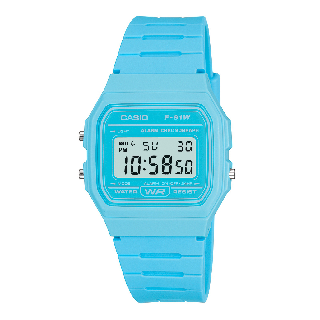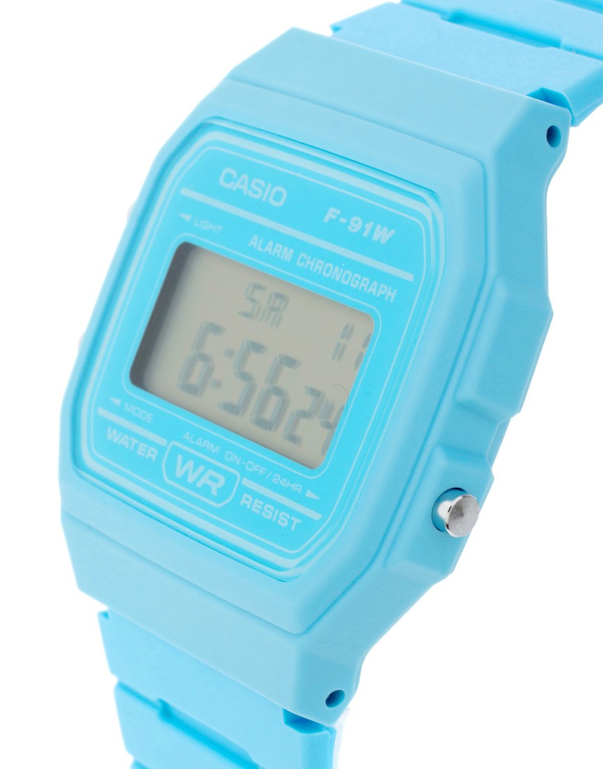 Modré hodinky Casio pro ženy i muže s digitálním ciferníkem. Jsou široké, retro a sportovní. Jejich modrý pásek z pryskyřice se napojuje na tenké pouzdro z pryskyřice. Zapínání je na přezku. Tyto hodinky s quartz strojkem jsou jednoduše kvalitním módním doplňkem. Jsou voděodolné do 3 ATM. Odolají dešti a mytí rukou.